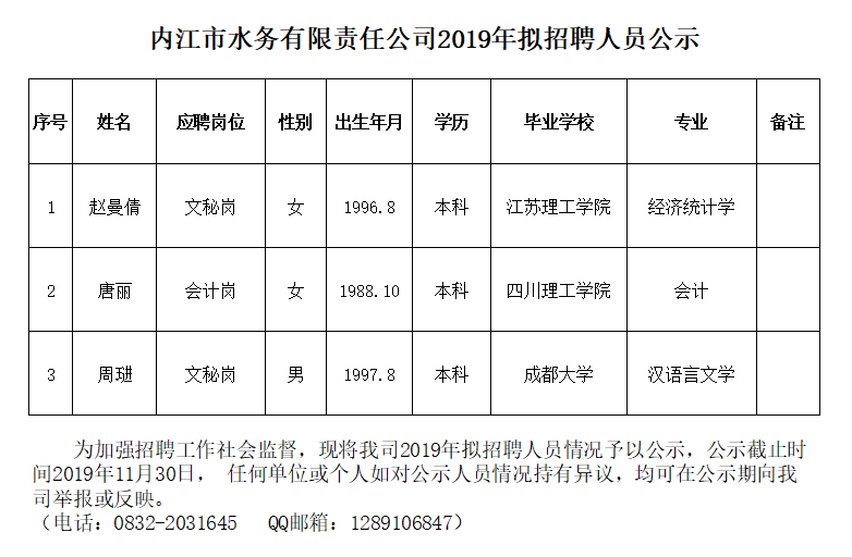 內(nèi)江市水務有限責任公司2019年擬招聘人員公示