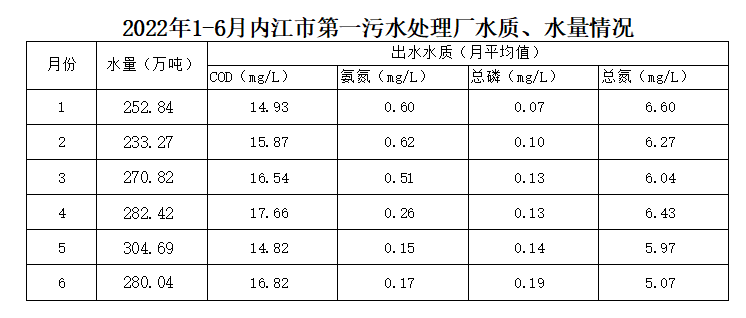 內(nèi)江市污水處理有限責任公司第一污水處理廠2022年1-6月水量、水質(zhì)情況