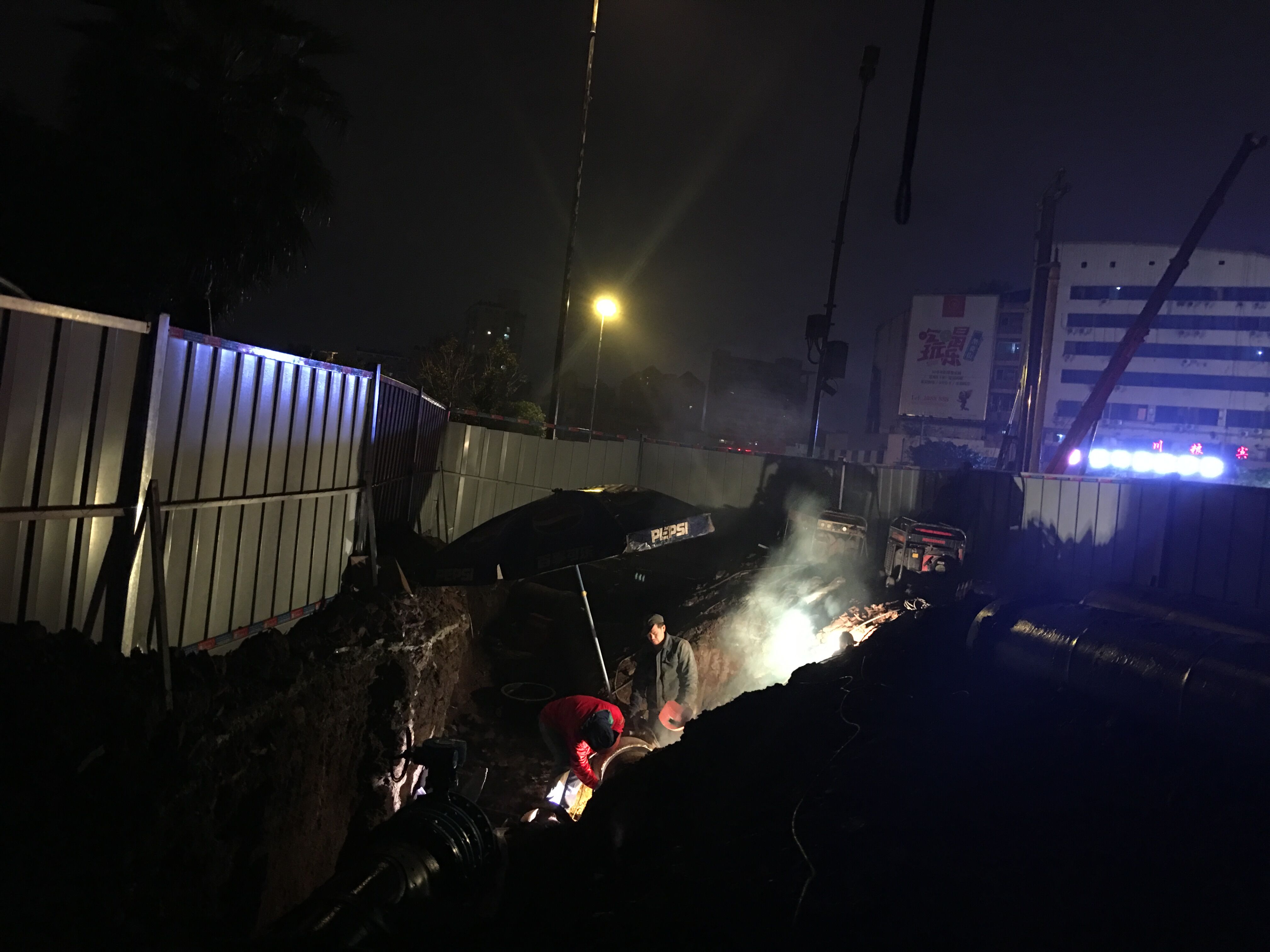 內(nèi)江市水務(wù)有限責(zé)任公司為配合西林大橋南北下穿工程順利進(jìn)行,積極組織豪盛安裝公司、工程管理部、管網(wǎng)運(yùn)行部等相關(guān)部門進(jìn)行西林大橋南北橋頭下穿DN500給水管道改造。為保證附近居民白天的正常用水,我司特意把工期定在晚上和凌晨。2016年11月22日晚上11點(diǎn)多,陰雨綿綿,寒風(fēng)刺骨,公司黨委副書記、紀(jì)委書記、工會(huì)主席李濤帶領(lǐng)黨群工作部提上涼菜、面包和牛奶到施工現(xiàn)場慰問挑燈夜戰(zhàn)、頂風(fēng)作業(yè)的加班人員。他們不畏嚴(yán)寒、不知饑餓,只為不影響居民正常生活、保證城市安全供水埋頭苦干的水務(wù)人,讓我們不得不心生敬意。