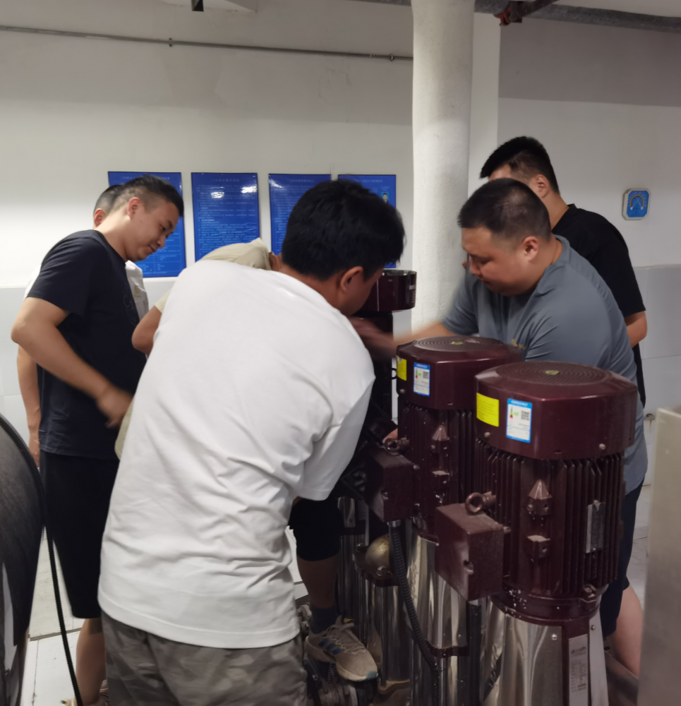 6月中旬,該小區(qū)有用戶(hù)反映水壓不穩(wěn)定。豪鵬二次供水公司收到信息立即組織人員前往現(xiàn)場(chǎng)排查,確認(rèn)是一臺(tái)水泵電機(jī)出了故障,引發(fā)電壓波動(dòng)所致。面對(duì)突發(fā)情況,公司迅速響應(yīng),立即組織人員對(duì)故障電機(jī)進(jìn)行拆解維修。6月17日下午,維修工作進(jìn)入電機(jī)重新安裝的關(guān)鍵階段,公司抓住這次實(shí)戰(zhàn)機(jī)會(huì),組織5名青年員工參與到此次技術(shù)練兵。通過(guò)此次培訓(xùn),員工們不僅掌握了電機(jī)維修與安裝的相關(guān)理論和維護(hù)技巧,更在實(shí)戰(zhàn)中深化了對(duì)二次供水設(shè)施運(yùn)行原理的理解。