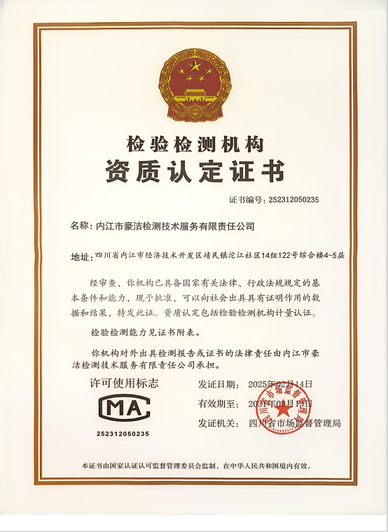 經四川省市場監(jiān)督管理局批準,內江市豪潔檢測技術服務有限責任公司正式取得《檢驗檢測機構資質認定證書》,此項資質的取得標志著我司在檢驗檢測方面已達到了國家相關標準和要求,具備了向社會提供公正、準確的檢測服務資質和能力。
