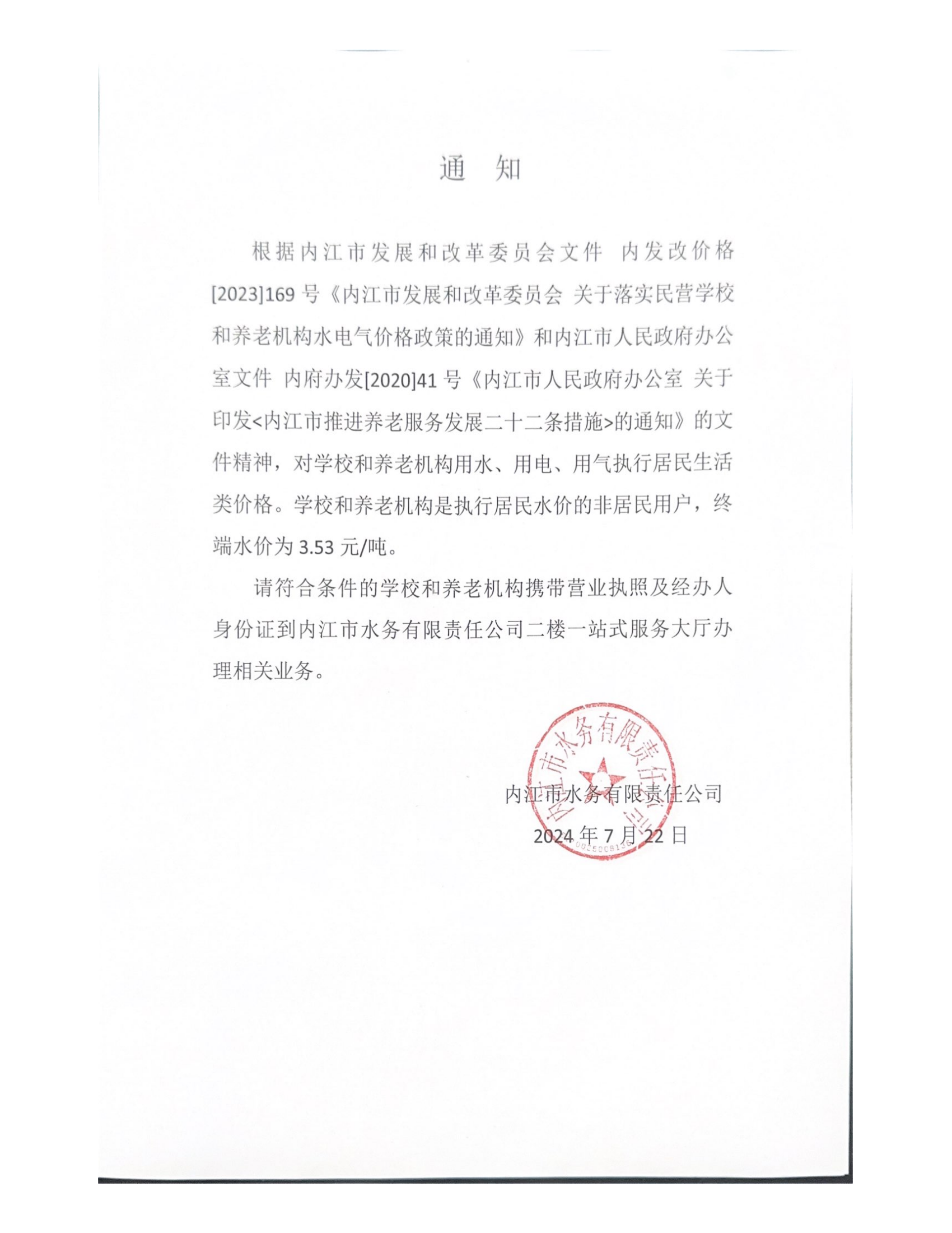 內(nèi)江市水務(wù)有限責(zé)任公司關(guān)于養(yǎng)老機(jī)構(gòu)、學(xué)校執(zhí)行生活用水價格的通知
