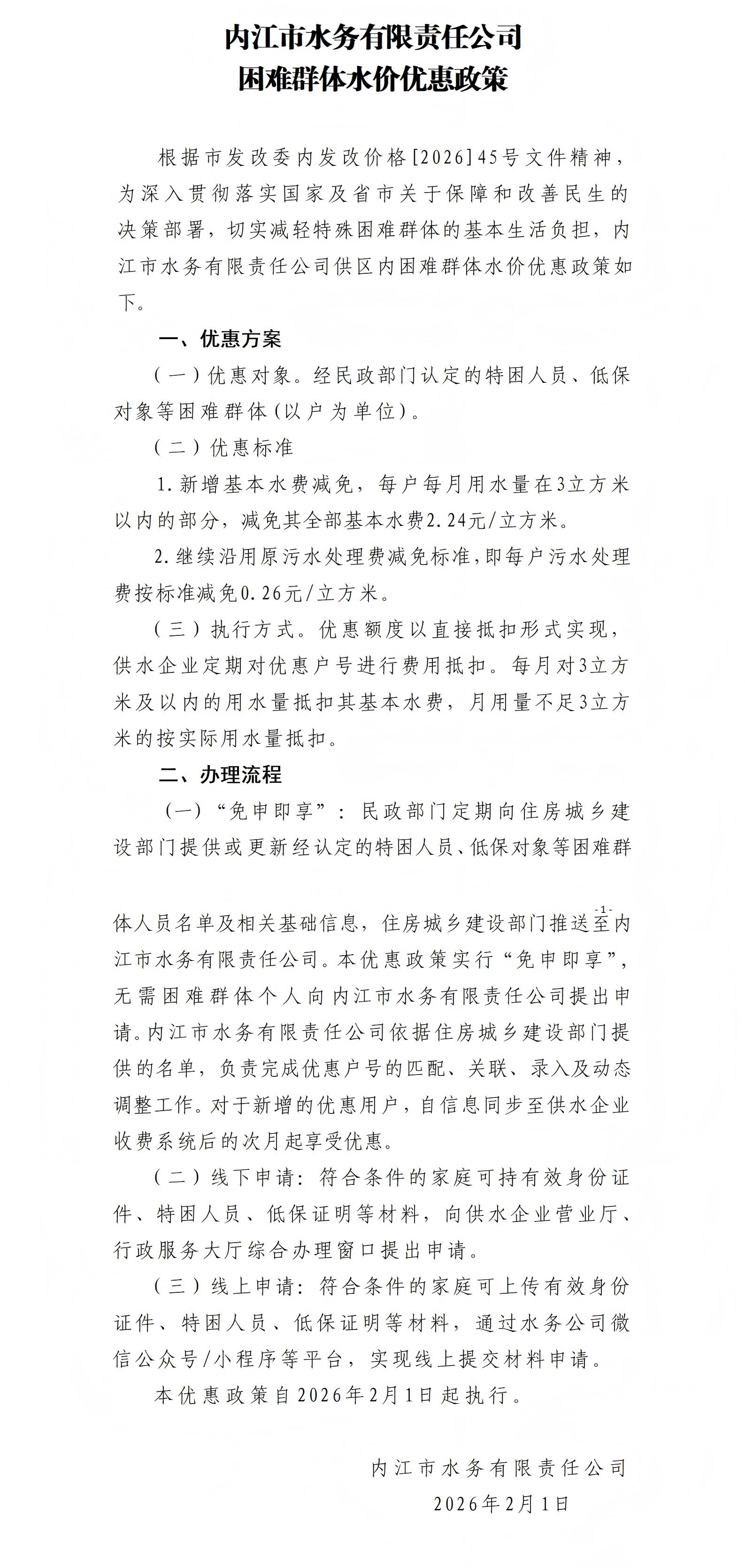 內(nèi)江市水務(wù)有限責(zé)任公司困難群體水價(jià)優(yōu)惠政策